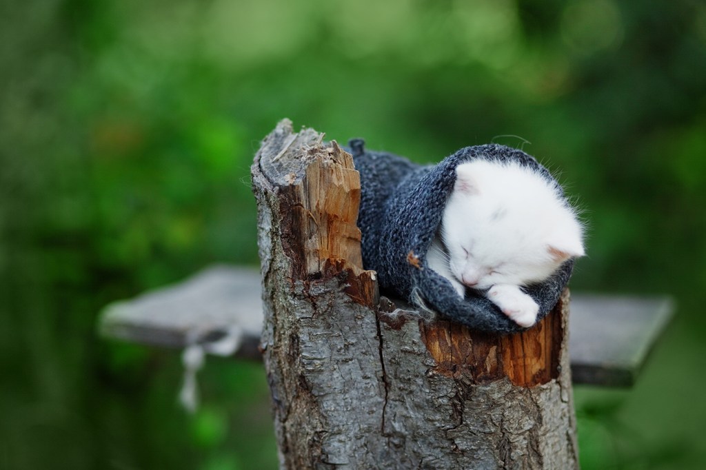 There on the top of the tree stump, tucked into a hollow, was a tiny white kitten. Newborn, its eyes and ears still remained closed. The tiny thing was asleep, wrapped up in a navy wool scarf.