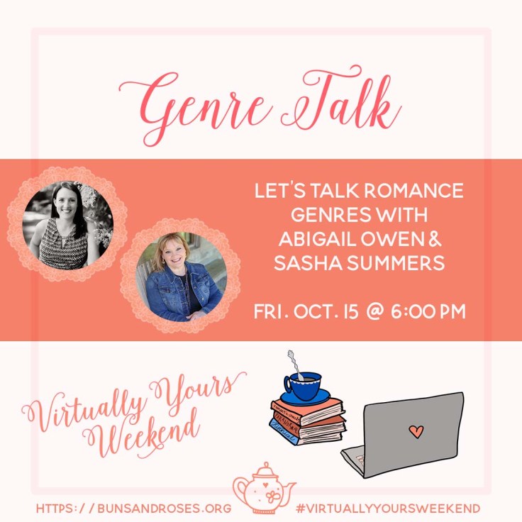 Sasha Summers & I (as Abigail Owen) will be hosting a session talking about our love of ALL the genres of romance. Our session is Friday, October 15, 6-6:45pm CT! I would love to see you there!